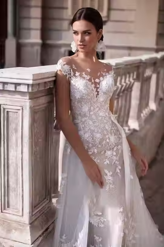 Available in a soft ivory tone, our gowns feature exquisite detailing, perfect for brides seeking a sophisticated and memorable look.